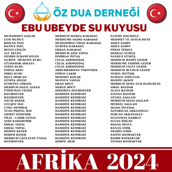 Öz Dua Derneği olarak, büyük bir mutluluk ve gururla Ebu Ubeyde su kuyusunun açılışını gerçekleştirdik. Bu önemli projeye katkı sağlayan tüm hayırseverlerimize sonsuz teşekkürlerimizi sunarız. Allah sizlerden razı olsun.